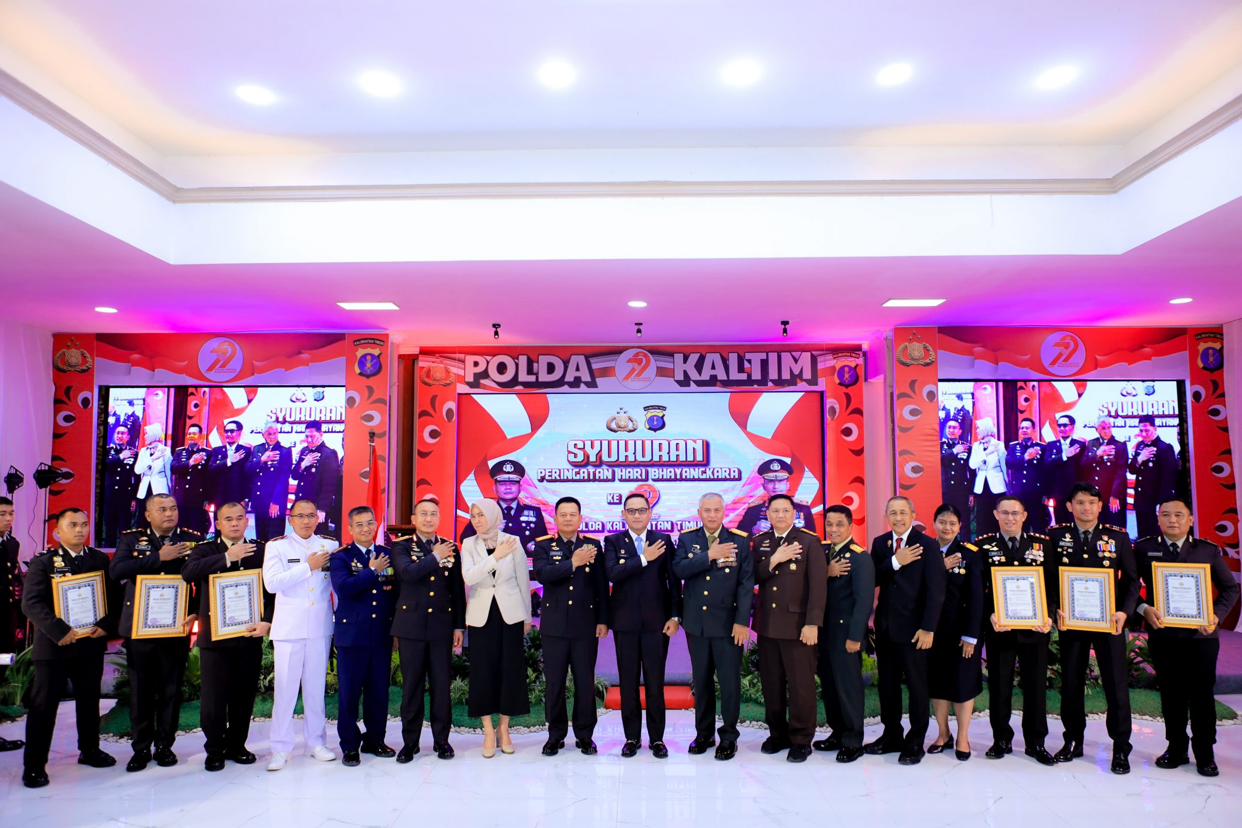 Kegiatan ini turut dihadiri Forkopimda Kalimantan Timur dan jajaran TNI–Polri, termasuk Danrem 091/ASN Brigjen TNI Anggara Sitompul, Kabinda Kaltim Brigjen TNI Priyanto Eko Widodo, serta para pejabat instansi vertikal dan tokoh masyarakat. Upacara melibatkan pasukan gabungan dari TNI, Polri, dan unsur terkait, serta dimeriahkan dengan penampilan tarian kolosal dan simulasi penyelamatan sandera oleh Sat Brimob Polda Kaltim.