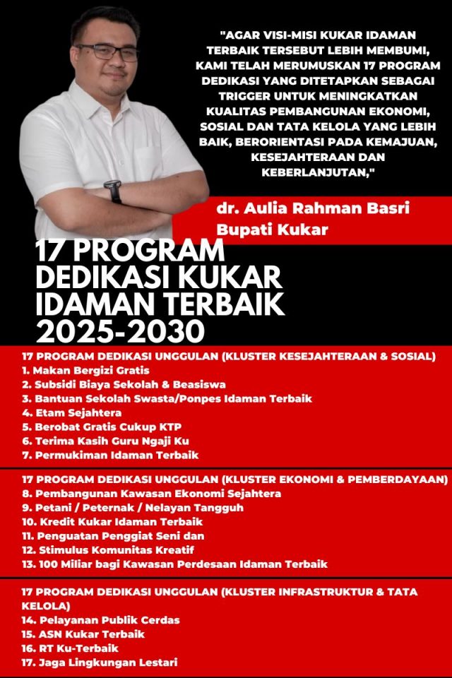 “Agar visi-misi Kukar Idaman Terbaik tersebut lebih membumi, kami telah merumuskan 17 program dedikasi yang ditetapkan sebagai trigger,” ujar Aulia.